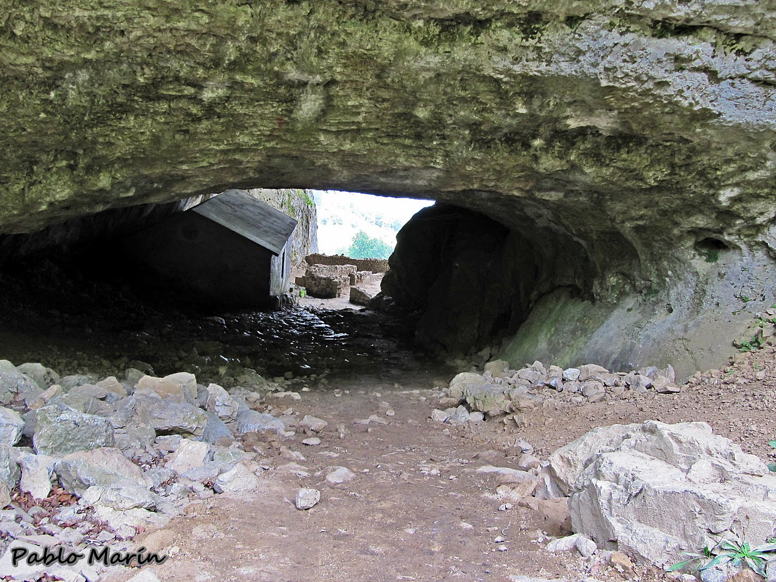 La oquedad no es muy prolongada. Se ve con nitidez la salida y tras recorrerla y comprobar que la pendiente todavía no ha terminado, llegamos a la abertura opuesta, donde la caverna apenas tiene dos metros de altura.